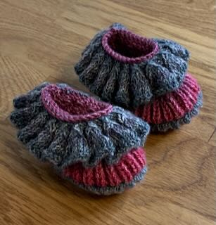 Ett sidenband skickas med som går att stoppa i stickade hål under volangkanten, vilket kan vara bra för att knyta tofflan allra först. Vartefter foten och vristen växer går bandet att ta bort och tofflan sitter fint ändå.