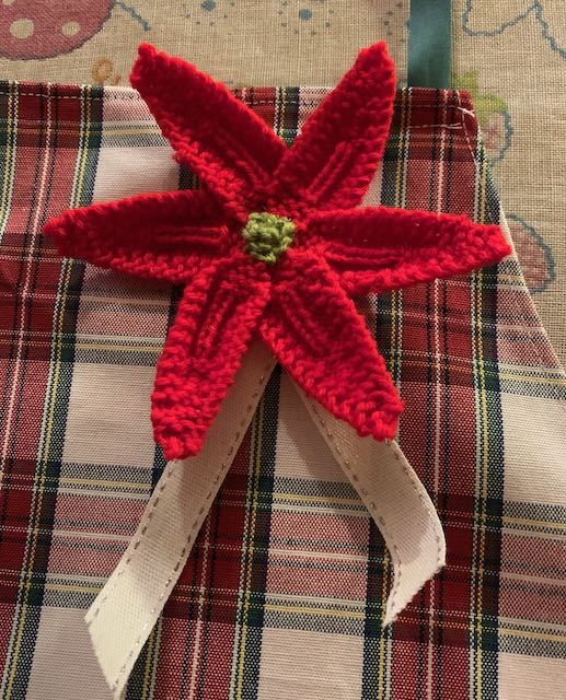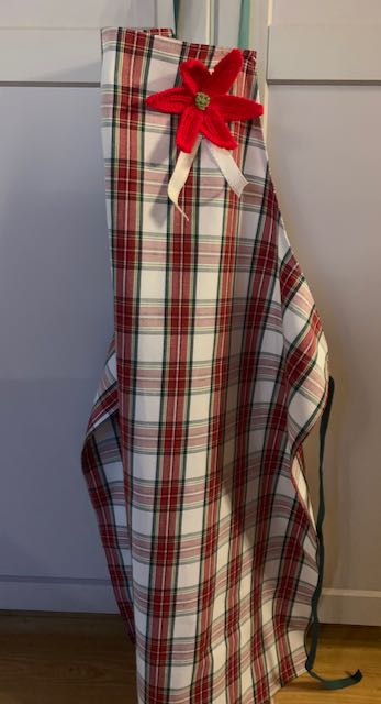 De förkläden som finns här är först och främst Limited edition! Det beror på två saker - dels använder jag mig av det som finns och räcker till för att sy ett förkläde. Dels skapar jag sådant jag tycker är kul, och därför kommer inte exakt samma att finnas i hur många exemplar som helst. Förkläde "Rut" är i vuxen-storlek och för tankarna till juletid med den stickade broschen i form av en julstjärna. Broschen, som sitter fast med en säkerhetsnål, bör tas bort innan förklädet tvättas. Tvätt 40°.